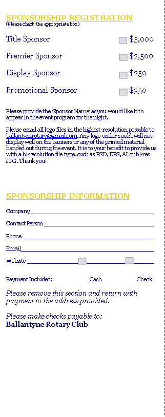 please contact: Axel Lindenbeck – Event Chair 704-231-4148 Patrick McCoy –Vice Chair 704-966-9224 Ann Saari – Sponsorship Coordinator 704-400-1124 Ineke Van der Meulen – Ticket Sales 704-846-6512 John Blair – Media & PR Coordinator 704-841-9803 Harold Howell – Club President 704-989-7724 Send emails to ballantynerotary@gmail.com