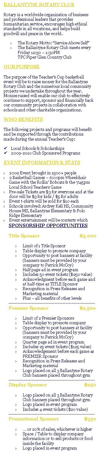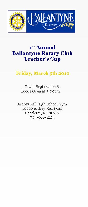 payments to: Ballantyne Rotary Club ATTN: Caryn Johnson – Teacher’s Cup 7725 Ballantyne Commons Pkwy. Suit 103 Charlotte, North Carolina 28277 For questions,